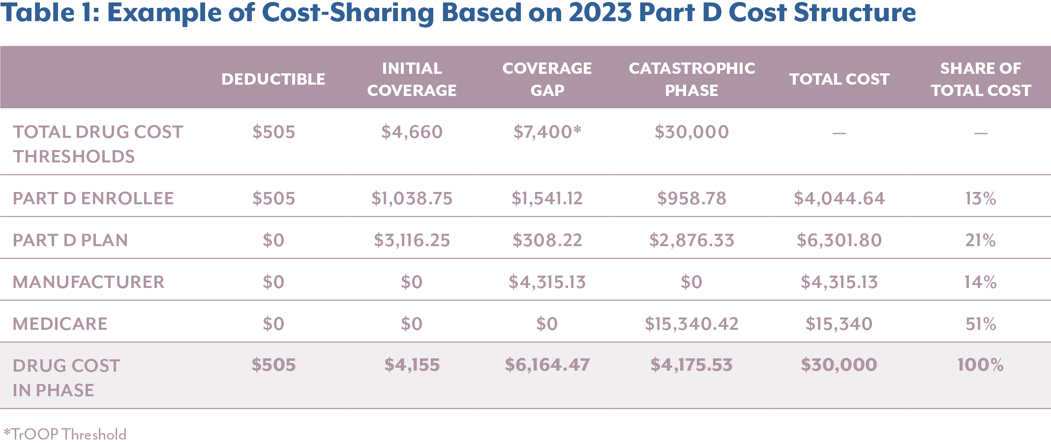- Initial Coverage Phase: Part D enrollees paid 25% of total drug costs, while the Part D plan paid 75%, up to $4,660 in total drug costs. At this point, a beneficiary would have paid the $505 deductible plus an additional $1,038.75 in coinsurance, amounting to a total true out-of-pocket (TrOOP) spending of $1,543.753.