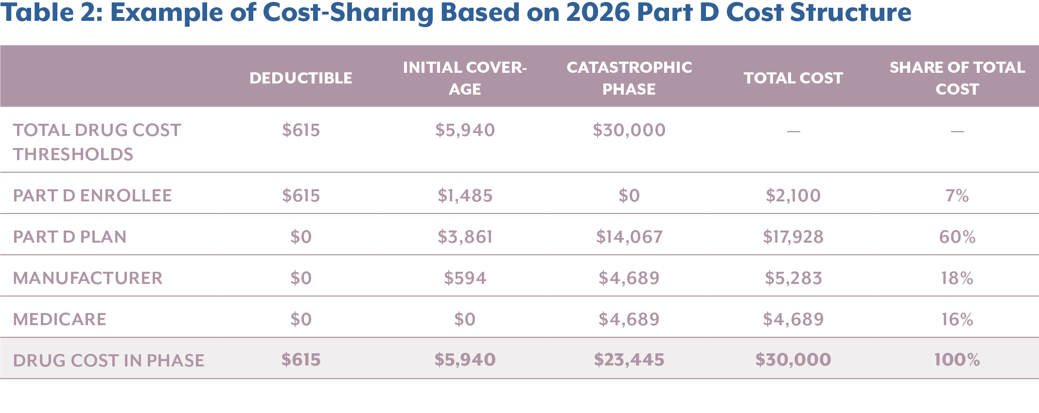- Catastrophic Phase: The enrollee pays no cost-sharing for covered Part D drugs, whereas the Part D plan pays 60% of costs and manufacturers pay a 20% discount on applicable drugs. CMS covers a 20% reinsurance subsidy on applicable drugs and 40% of costs for all other covered Part D drugs that are not classified as applicable, including select drugs during the price applicability period.